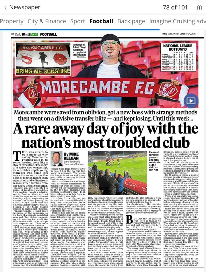 A few days later I was surprised to appear photographed in an article about Morecambe in the Daily Mail. Their reporter had been amongst us, making up one of the forty-eight who travelled to the game.